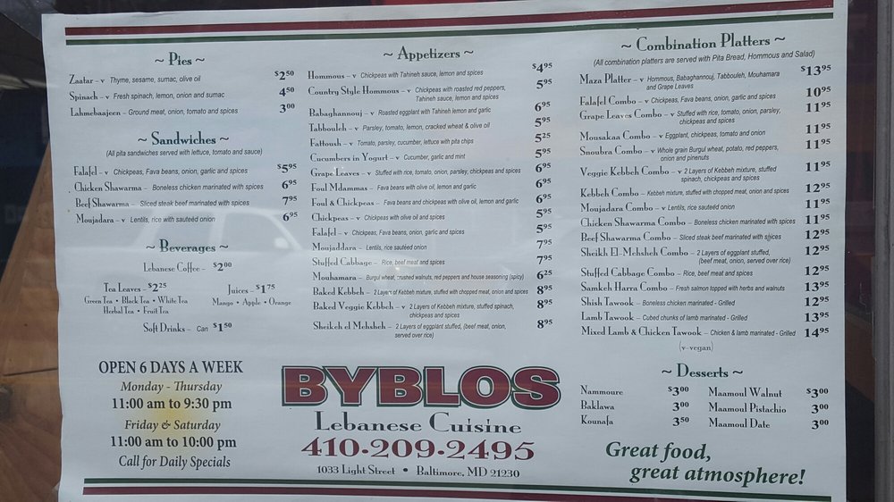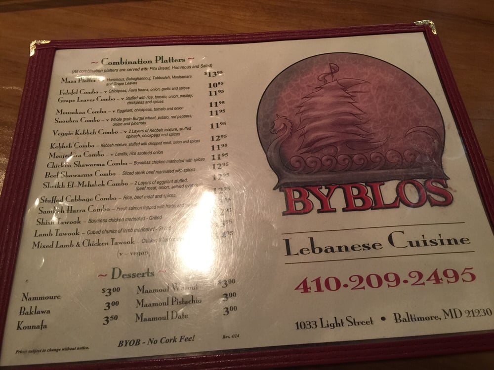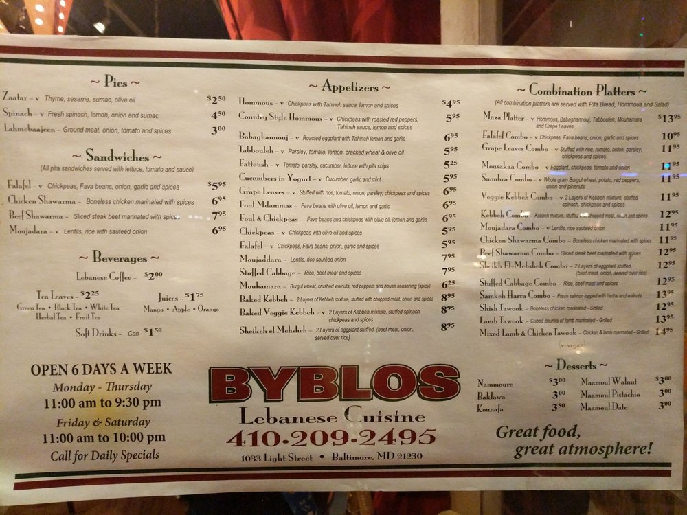 Welcome to Byblos, a delightful culinary haven in Baltimore that brings the essence of Mediterranean flavors to your plate. Nestled at 1033 Light St, this charming venue offers a warm and inviting atmosphere, perfect for a casual dining experience or a special gathering.